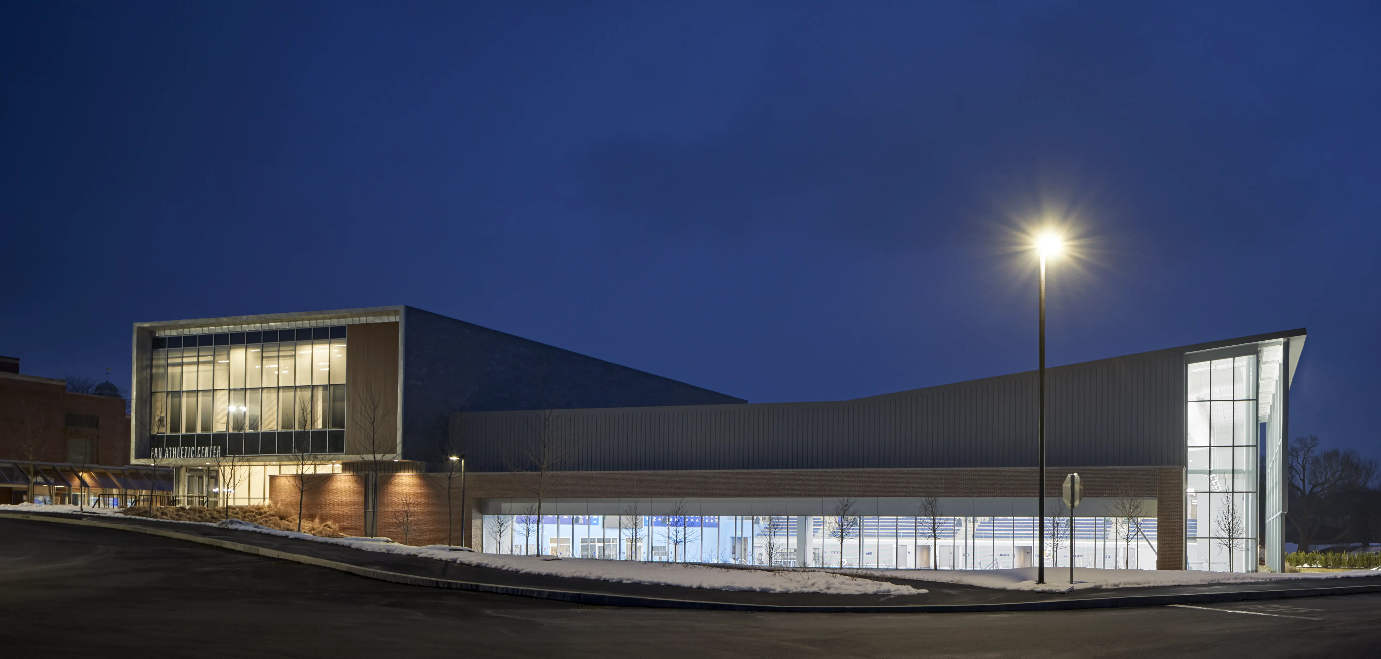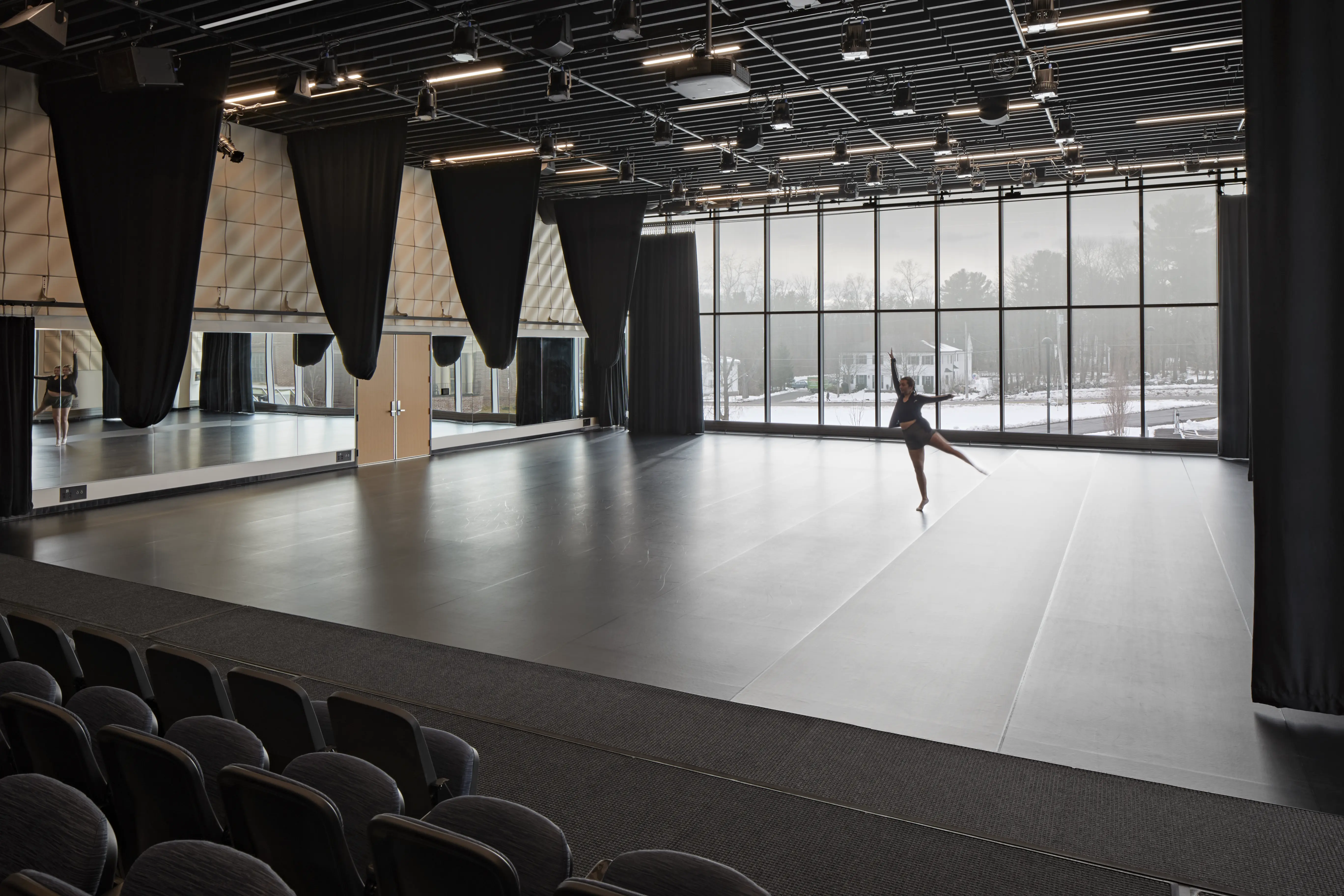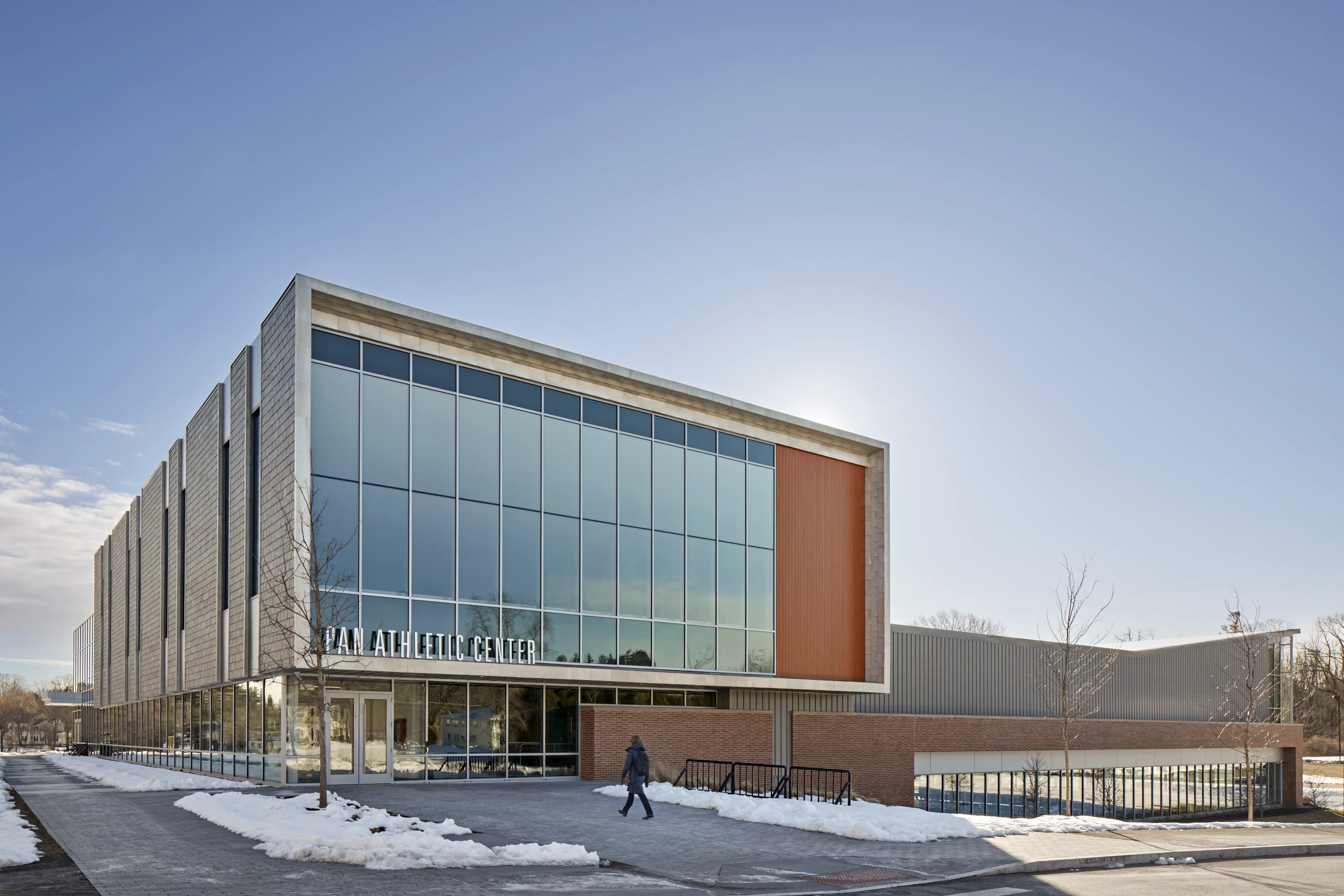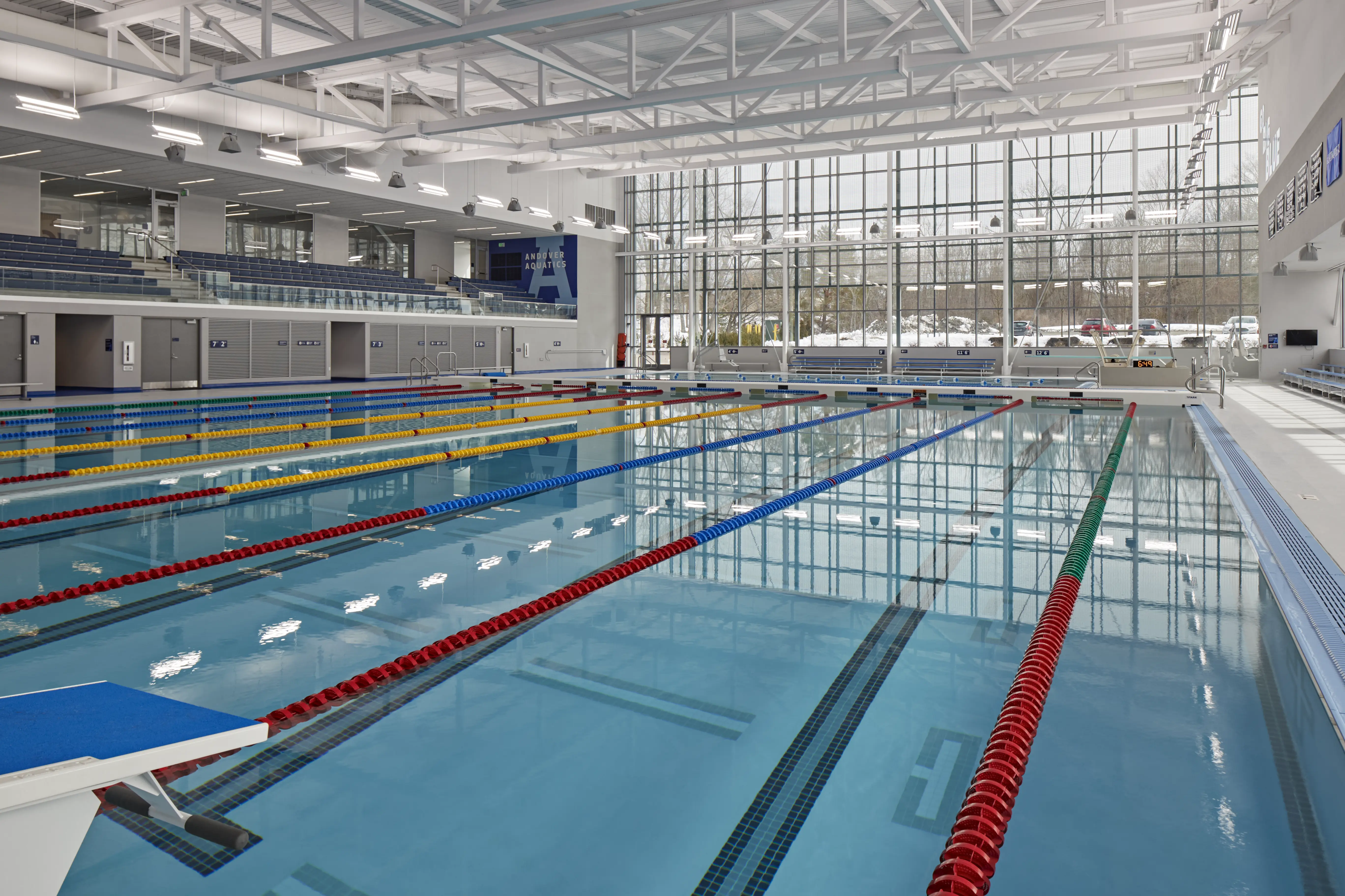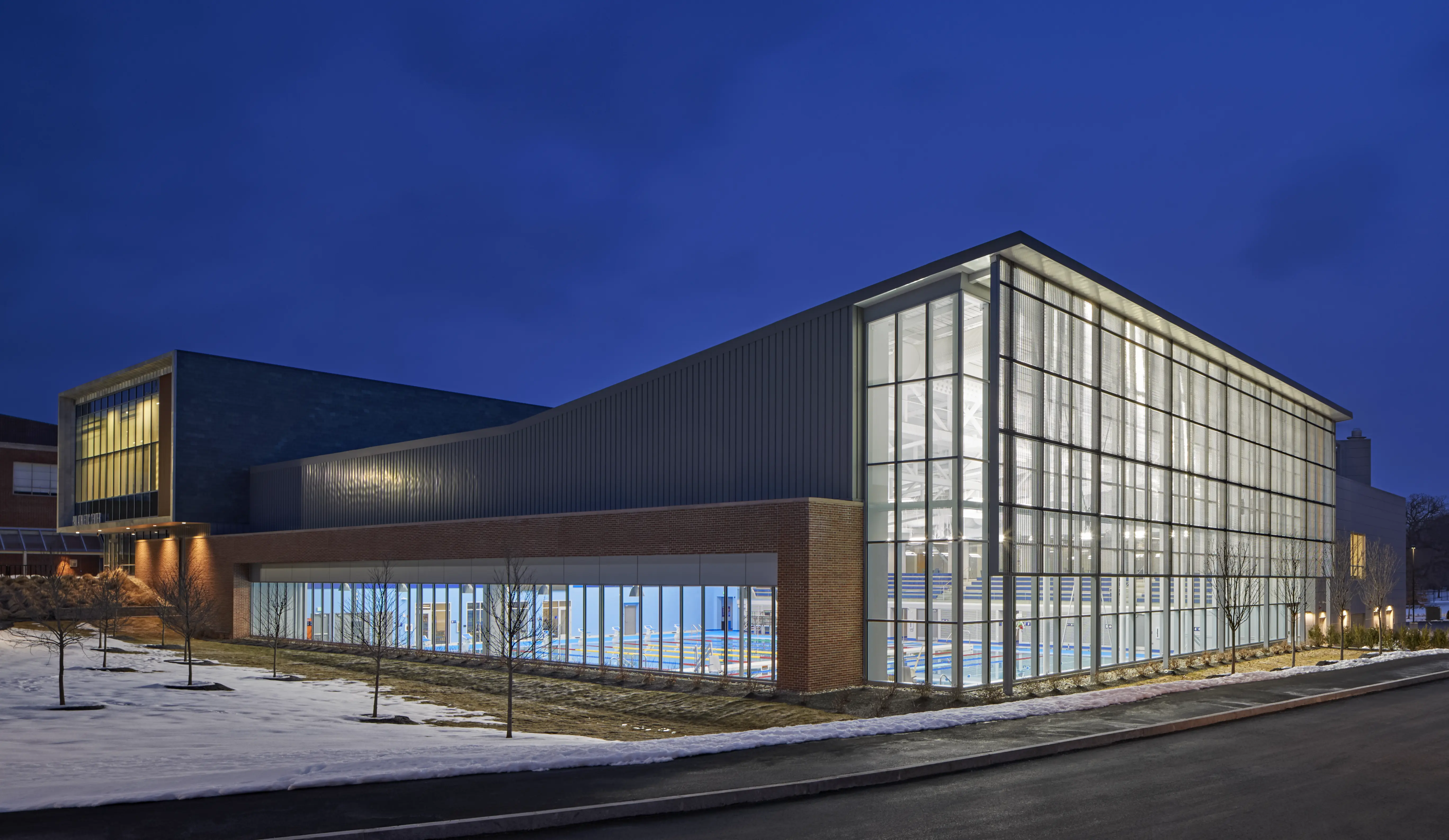 A design-build project, this three-story 70,000 sq-ft athletic facility at Phillips Academy houses a swimming pool, locker rooms, wrestling arena, two-story atrium with office and a dance performance studio. Use of long-span heavy steel trusses over the swimming pool and bleachers allow for uninterrupted views of the entire Natatorium area.